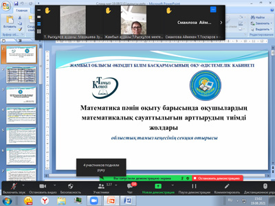 «Математика пәнін оқыту барысында оқушылардың математикалық сауаттылығын арттырудың тиімді жолдары» тақырыбында аудандар мен Тараз қалалық білім бөлімдерінің әдіскерлері мен математика пәнінің мұғалімдеріне арналған облыстық тамыз кеңесінің секция отырысы өтті.